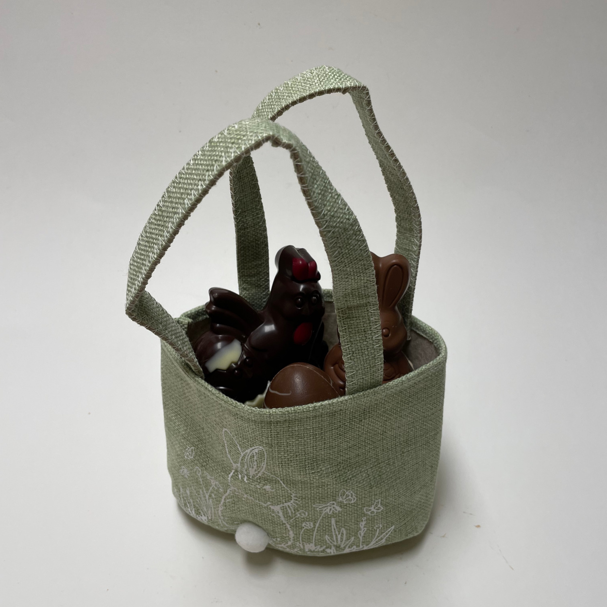 Cello zakje mét decor gevuld met 3 holle paasfiguurtjes, 2 caraques en 22 kleine eitjes